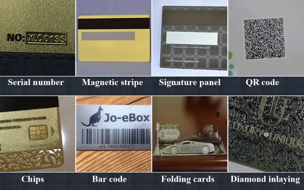 Magnetic stripe, numbers,(concave code, convex code, flat code, flat code, printing code), signature panel, series number punch, holes punched, bar code, QR code, chips, etc. |