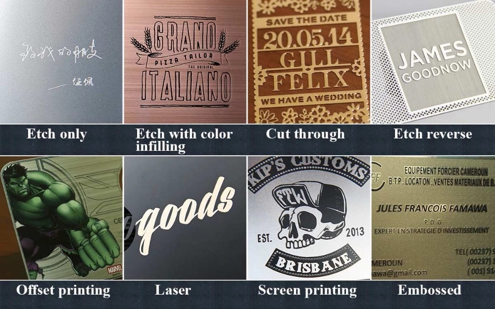 Etching, plating, engraving, laser cutting, carving, embossed, cut out, holes punched, hologram |